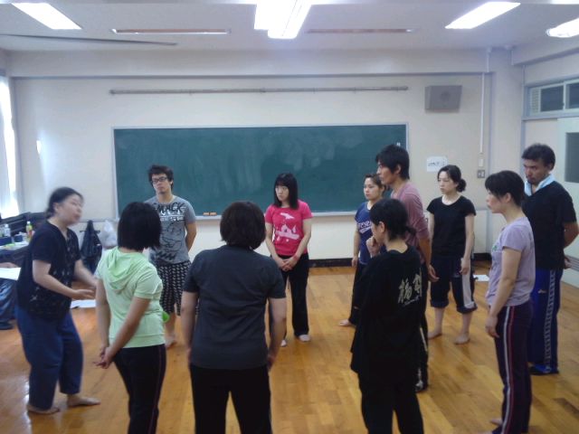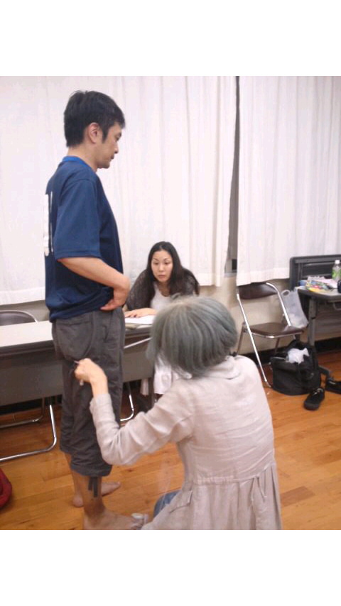 今日はまず、昨日ブロッキングしたリアのセリフの復習から。それぞれのブロックを、リアのどんな顔を使って喋るか(国王・父親・男・子供・老人・狂人など)を各自で考え、いろんな身体で表現してみるということをしました。仲間が見守るど真ん中で演じると、その緊張や焦りに引っ張られそうになります(-o-;)。しかも、外では雷が自然の効果音とばかりにビカビカゴロゴロどっかーん。ひえ~。でもいろんなリアが生まれました☆しかし、当然王公貴族ではない私たちが、彼らのような意識の肉体を持つのは大変です。
