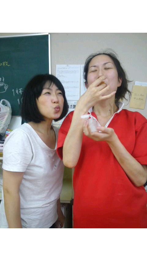 休憩時間。山岡さんが持ってきて下さった高級な梅干しをほお張る、山谷姫。横で今泉さんがエア梅干し(笑)。