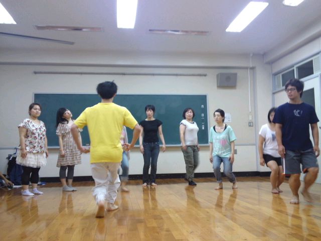 身体がほぐれたところで、今度はキャストの辻さん主導の歩く稽古。先ほど感じた大きさを使って、王公貴族として歩く。スピードが変わっても持っている大きさや存在を損なわない。時には5才の子どもと王公貴族を行ったり来たり。結果、みんな汗だくです(*_*)。